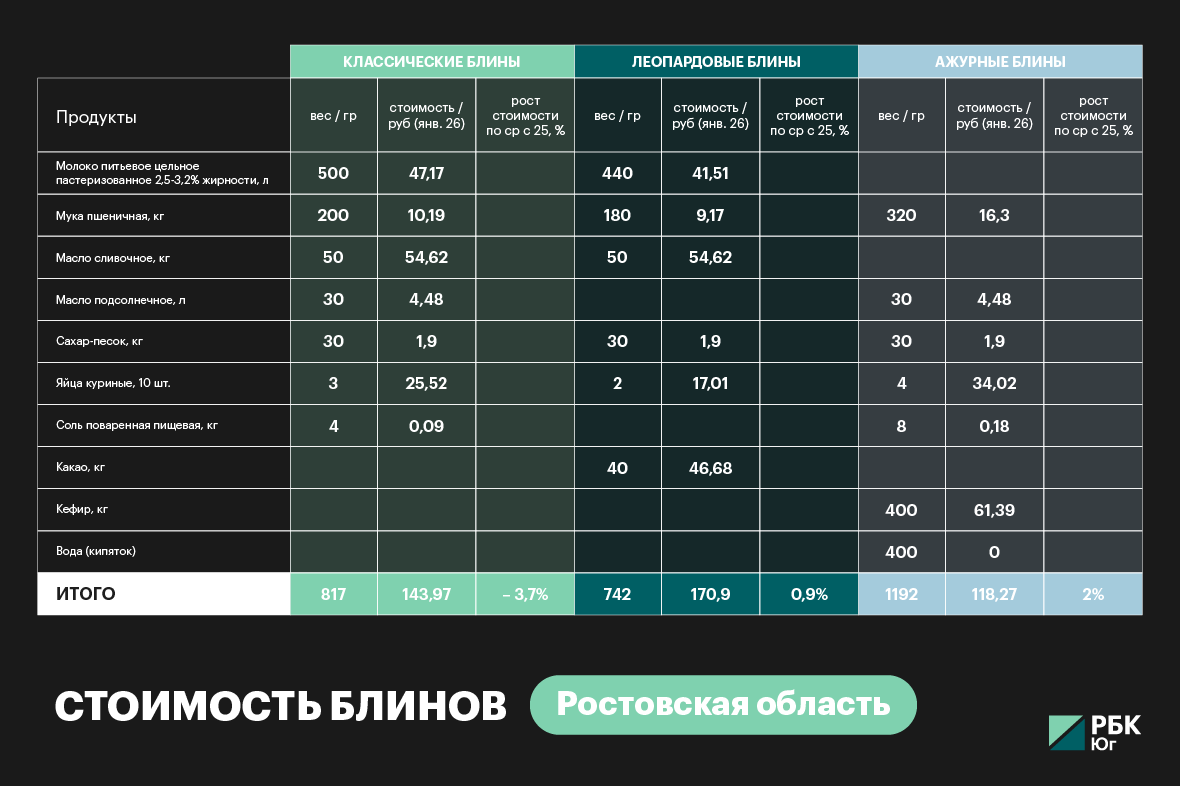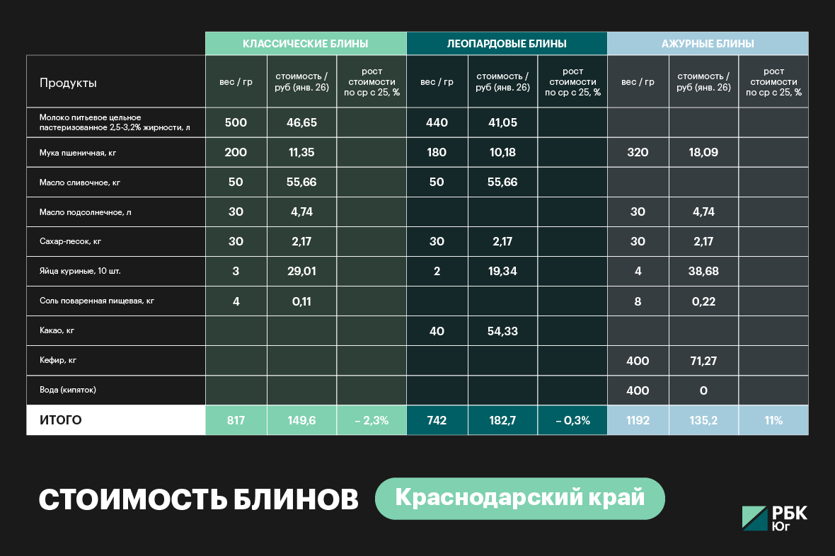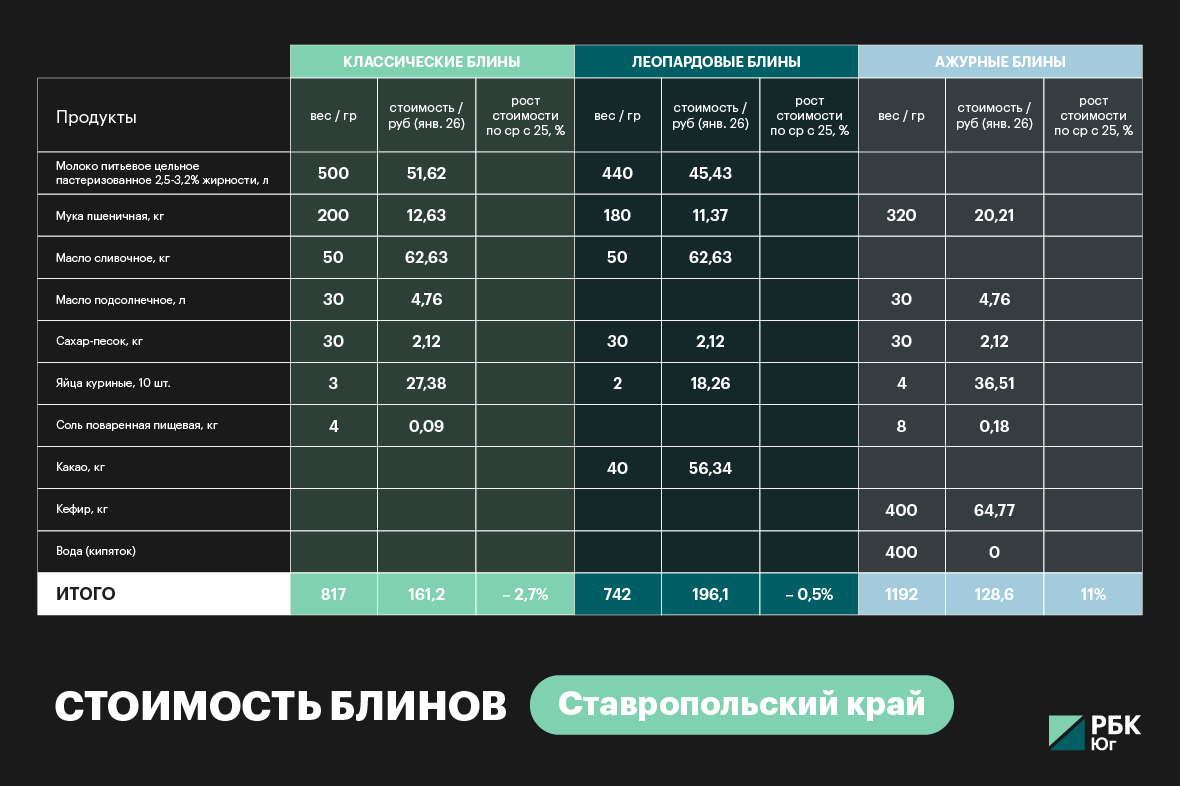 «На Кубани приготовление стопки блинчиков, сдобренных сливочным маслом, на семью из четырех человек будет стоить 150 руб. За год стоимость лакомства снизилась на 2,3%, или на 3,5 руб.», — говорится в ответе регионального управления на запрос редакции.